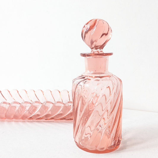 Garniture de toilette en verre moulé rose à côtes torses. BAYEL