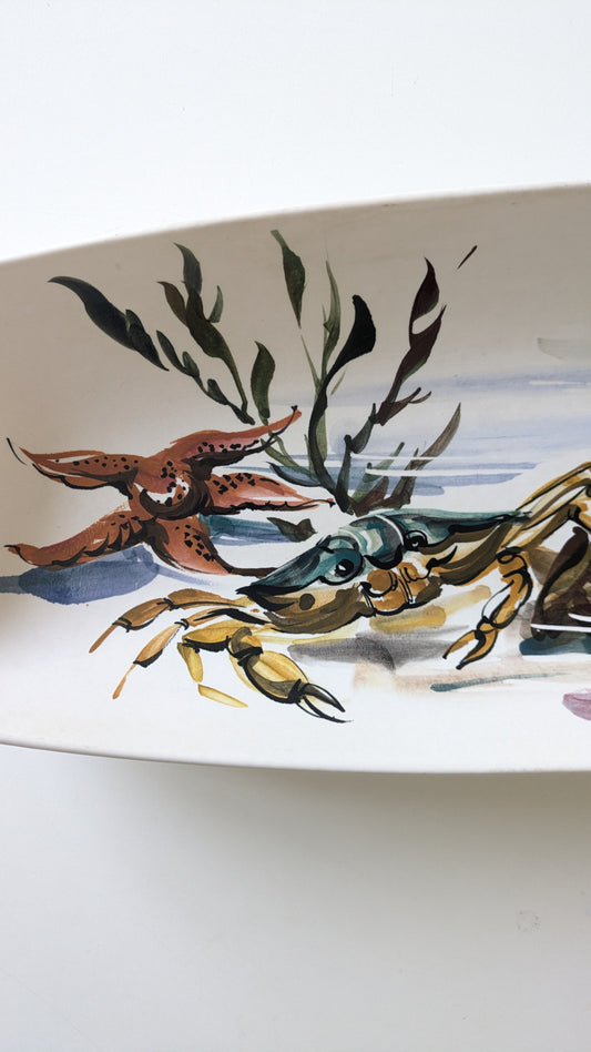 Grand plat Style Vallauris vintage 60-70 décor crustacé peint à la main