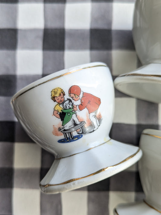 Lot de 3 Coquetiers Vintage Porcelaine - Décor Enfantin & Liseré Or (Années 50/60)