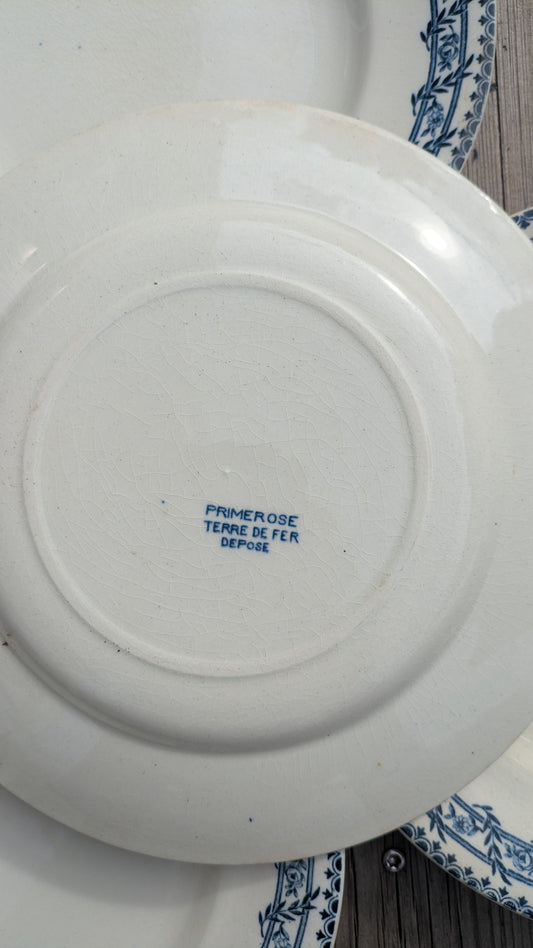 Lot de 4 assiettes plates anciennes en terre de fer modèle Primerose