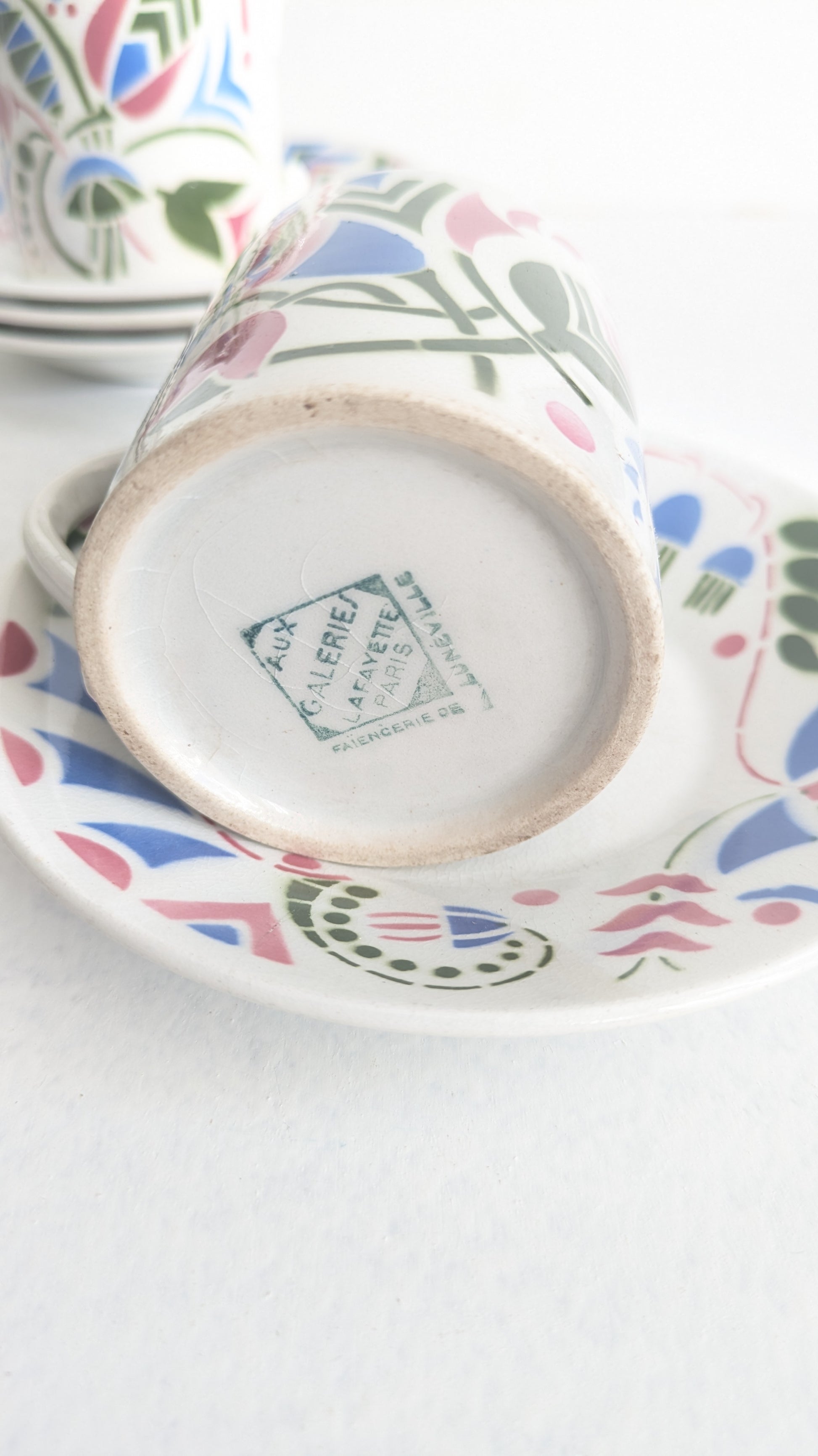 Ensemble Lunéville Aux galeries Lafayette Paris, 2 tasses et sous tasses, 3 sous tasses, une tasse cassée, une cafetière avec léger fêle au couvercle.