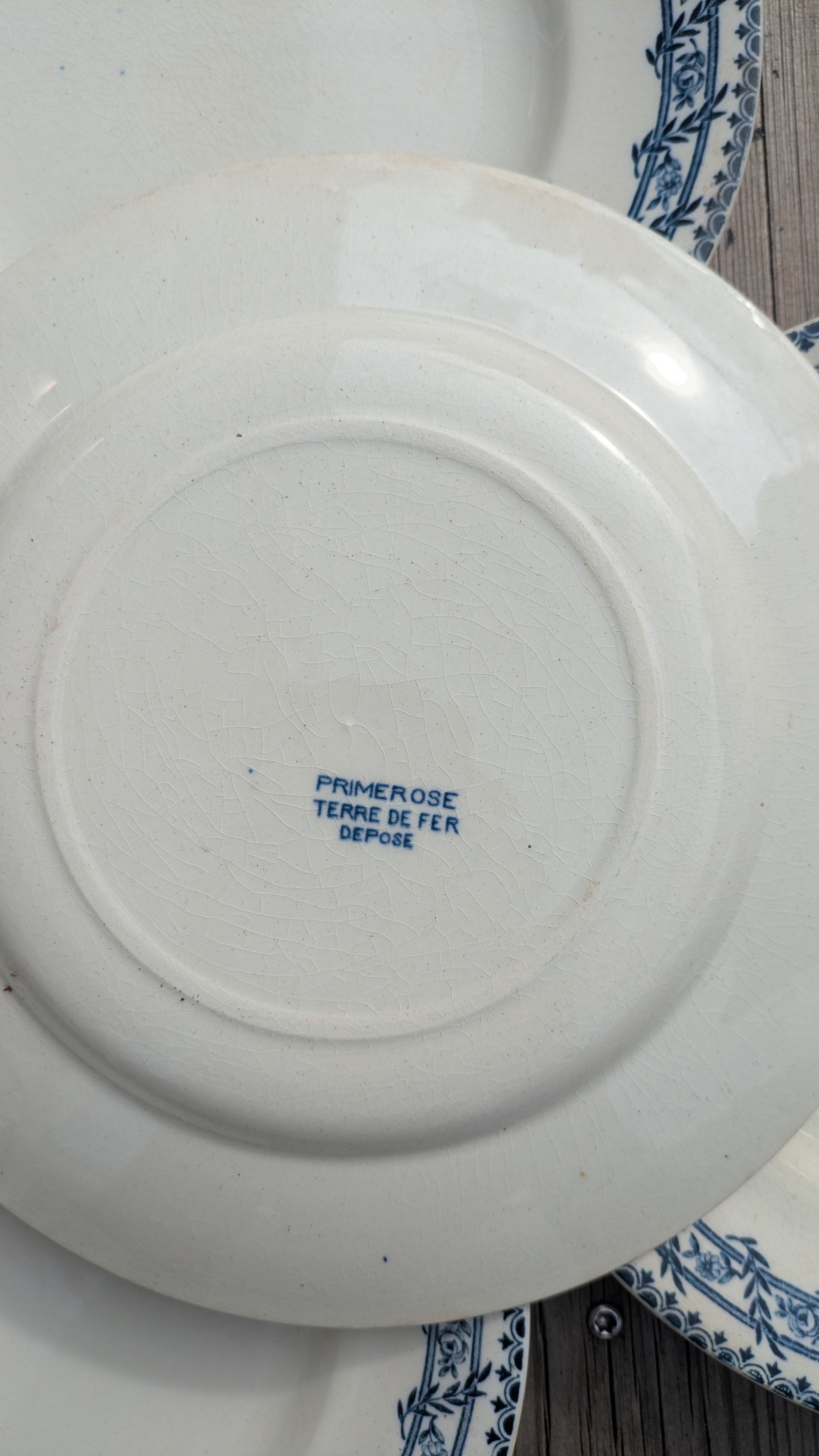 Lot de 4 Assiettes Plates Anciennes - Terre de Fer Modèle Primerose- Décor Floral Bleu