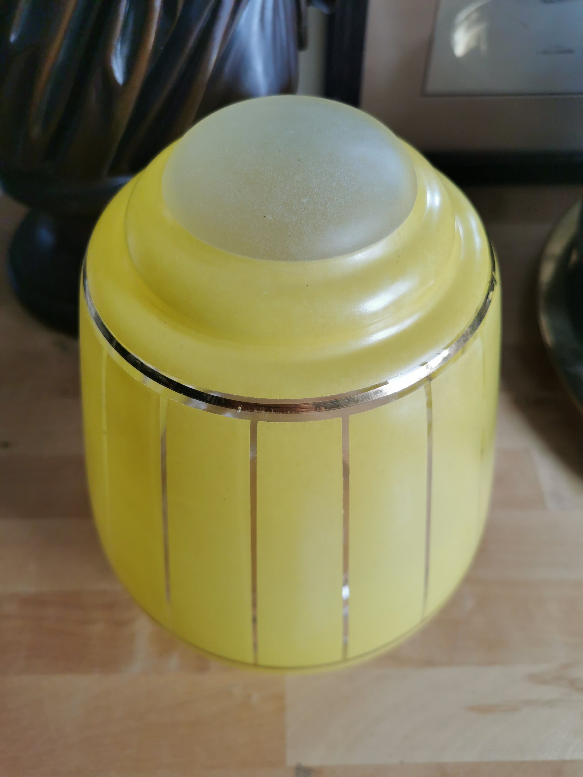 Magnificent globe in yellow granite glass and gold edging. Some missing parts on the gold edging, slight scratches from use. Height 25cm Opening diameter 10cm