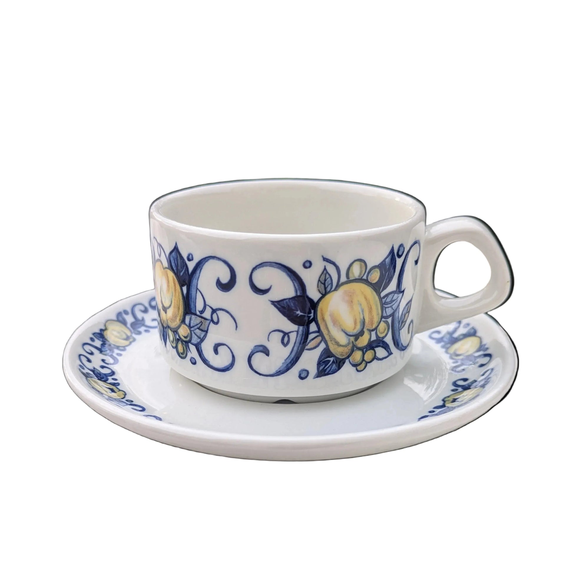 Apportez une touche de sud et d'histoire à votre rituel café avec ce superbe duo tasse et sous-tasse expresso Villeroy & Boch. Issue de la célèbre série Cadiz, cette pièce se distingue par son motif fruité aux teintes solaires et ses volutes bleues élégantes, typiques du savoir-faire de la manufacture luxembourgeoise.