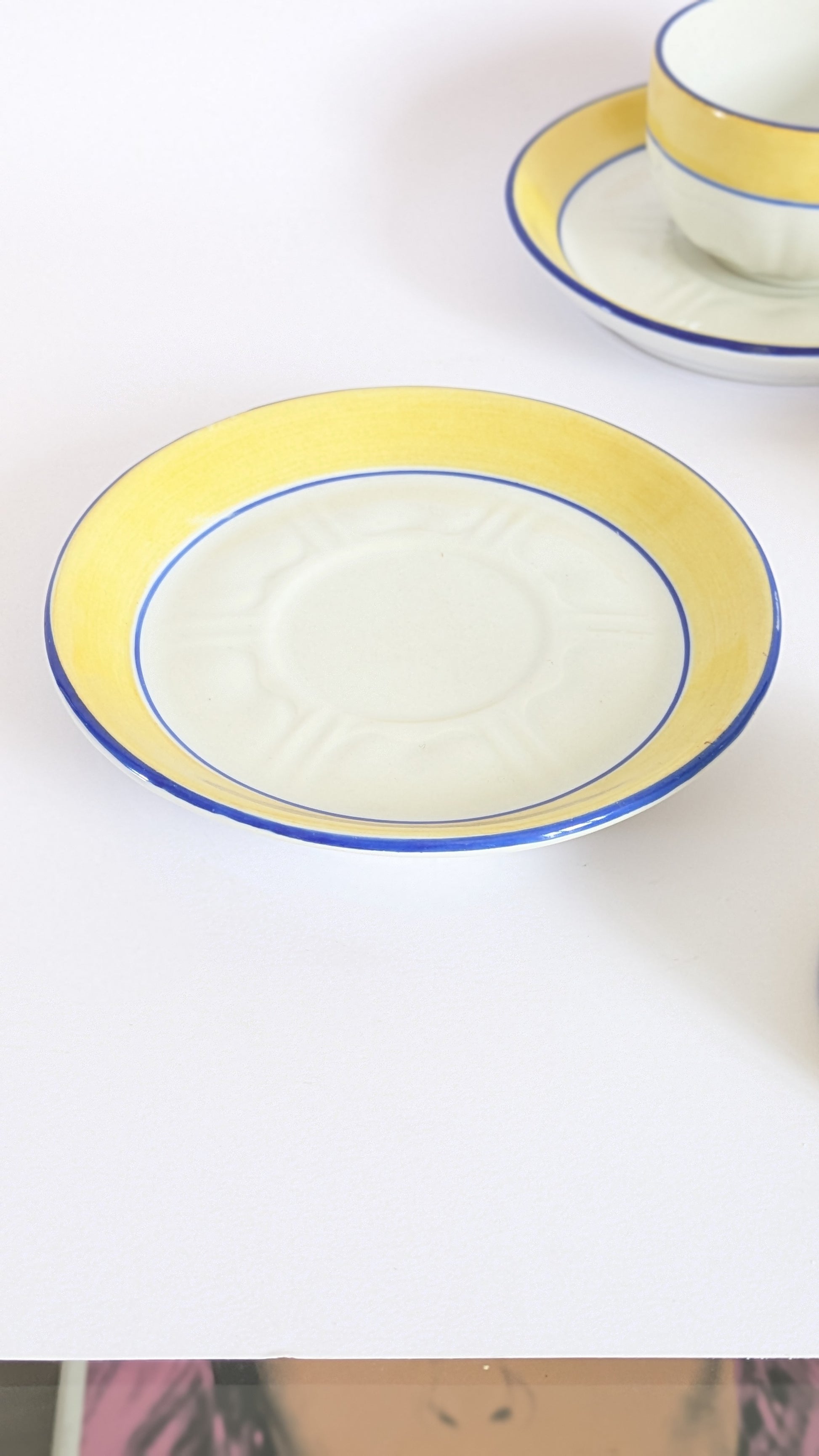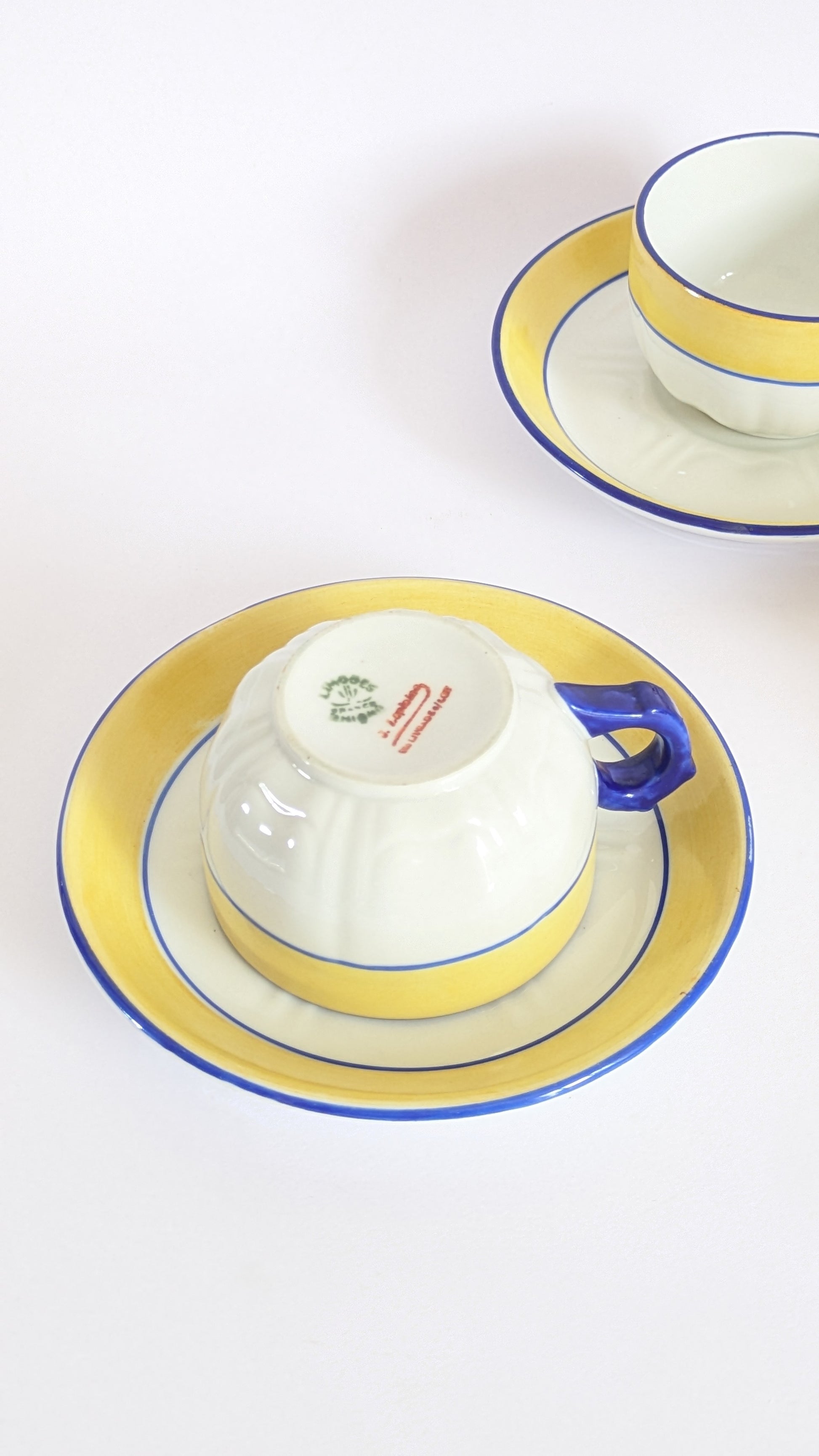 4 tasses à café et sous tasses en porcelaine de Limoges, style Art Déco, jaunes, bleu et blanc. Très bon état général.