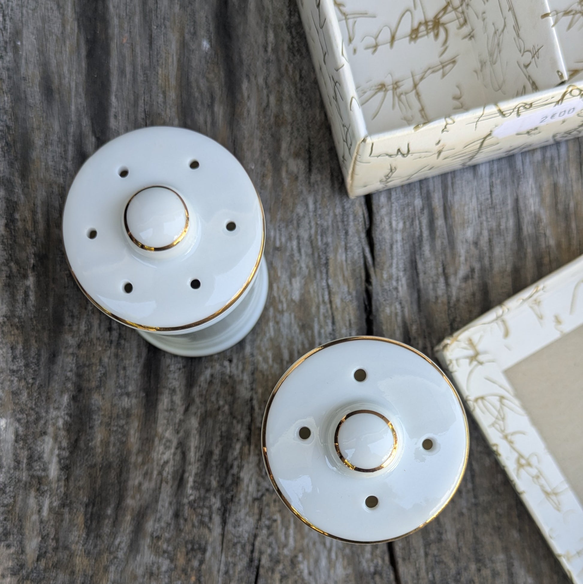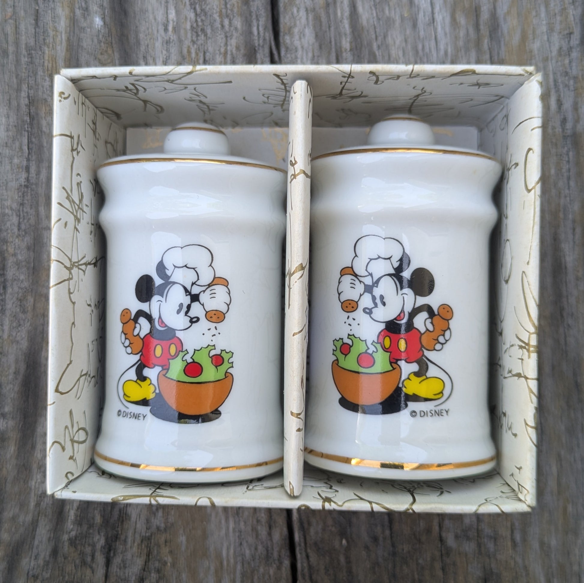 Ce charmant duo salière et poivrière en porcelaine fine met en scène Mickey Mouse en chef cuisinier, prêt à relever vos plats avec style. Fabriquées au Japon, ces pièces délicatement dorées sont présentées dans leur boîte d’origine, ce qui en fait un objet de collection rare pour les amateurs de vintage et les fans de l’univers Disney