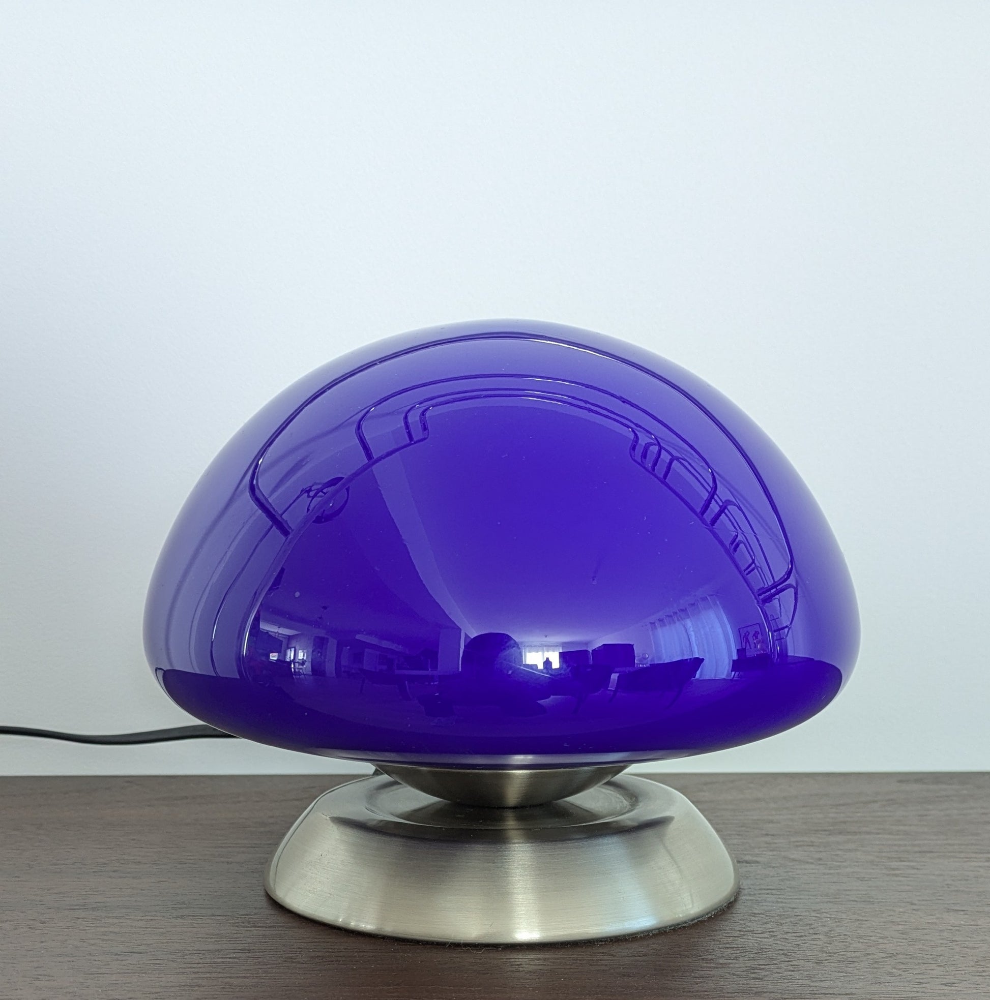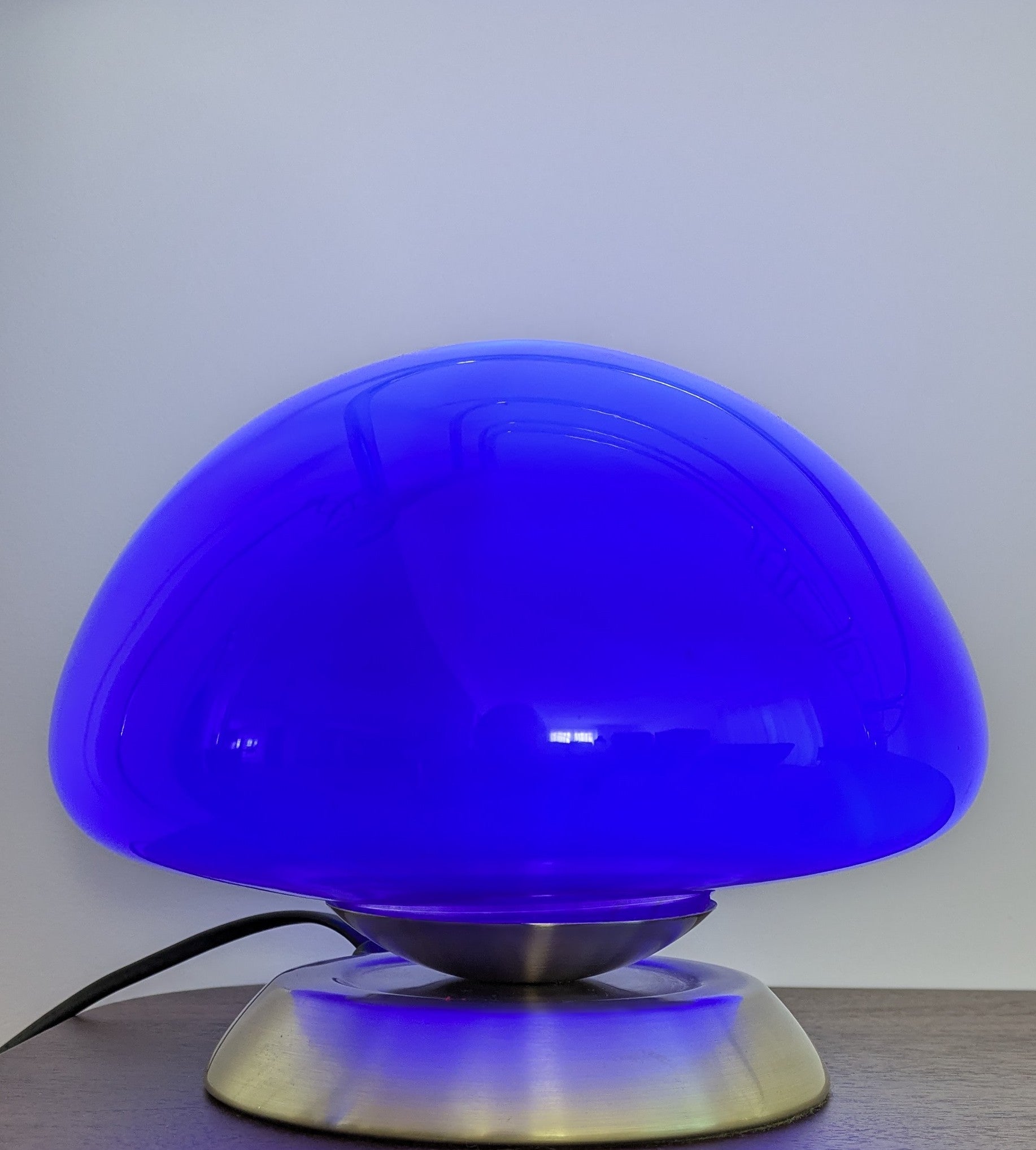 Lampe vintage ufo, champignon, avec verre opalin bleu, allumage tactile avec 2 intensités. Très bon état général.