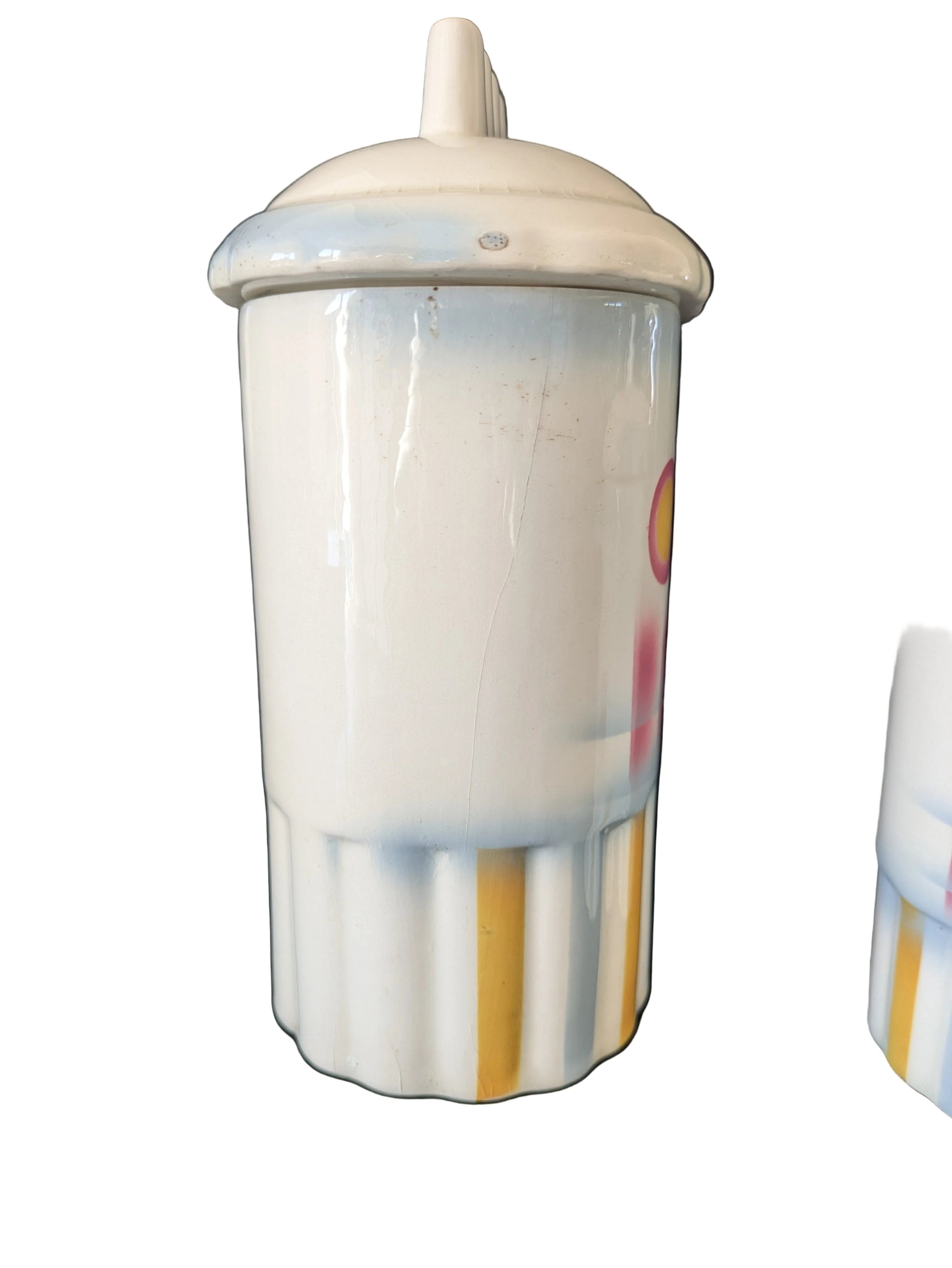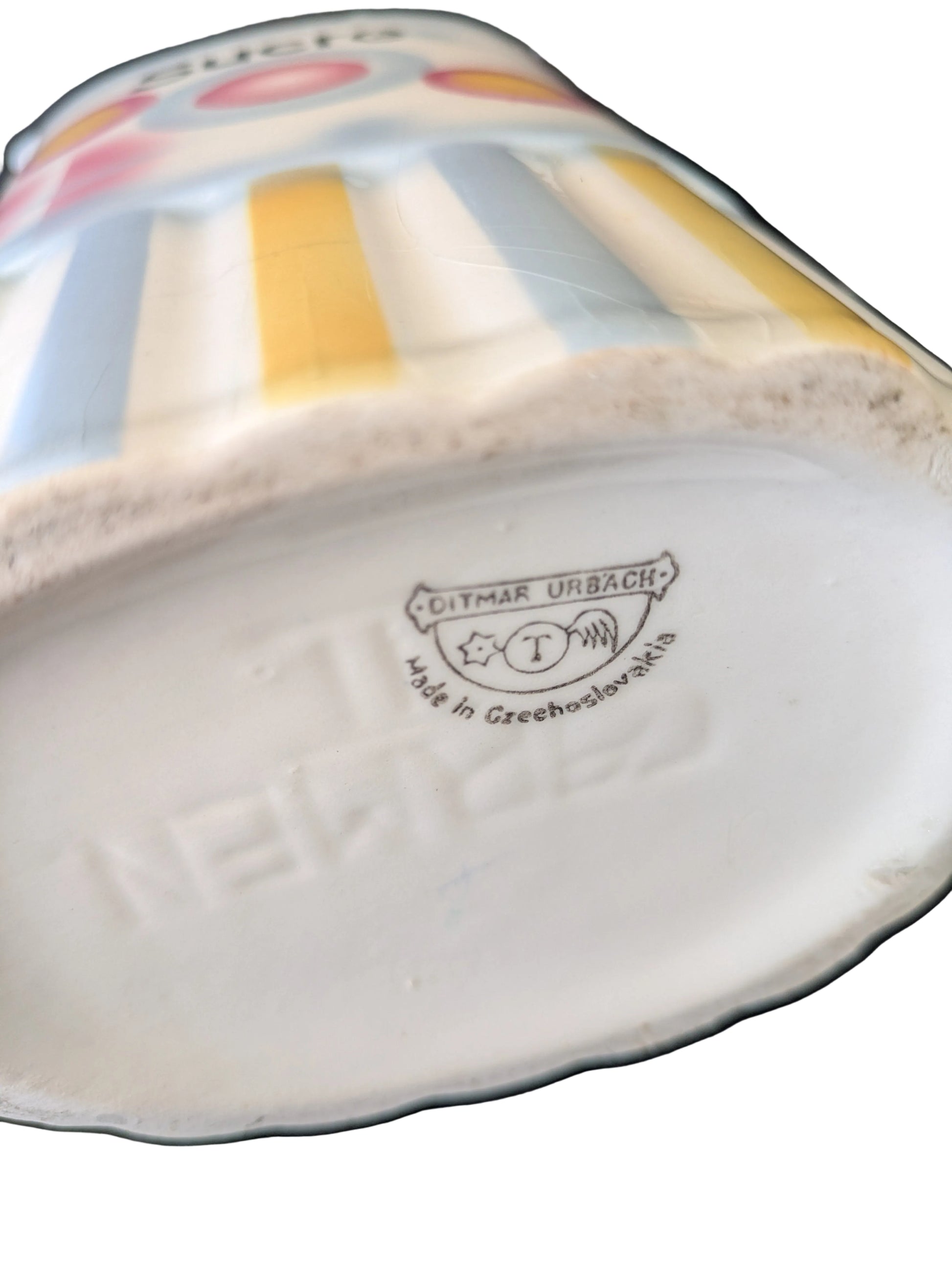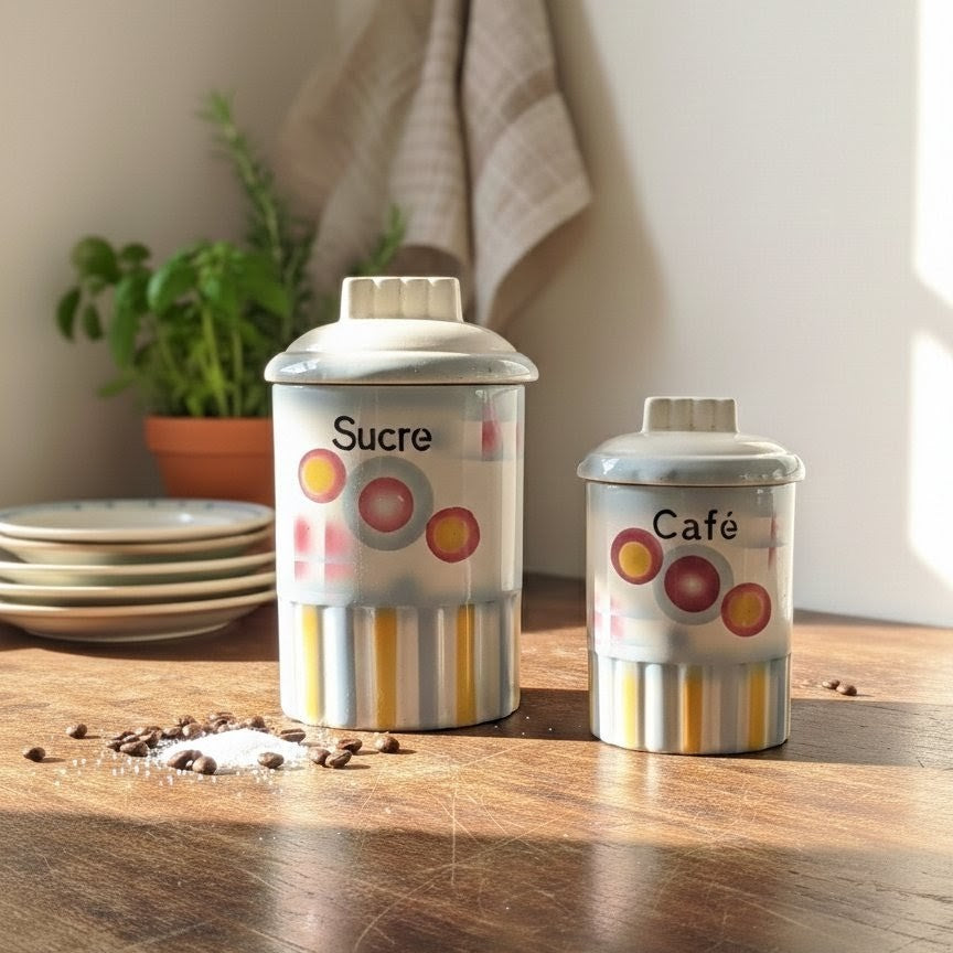 Lot de boîte de conservations anciennes, sucre et cafè, modèle Carmen Ditmar Urbach. État satisfaisant pour le pot sucre. Pot café avec fêle important.