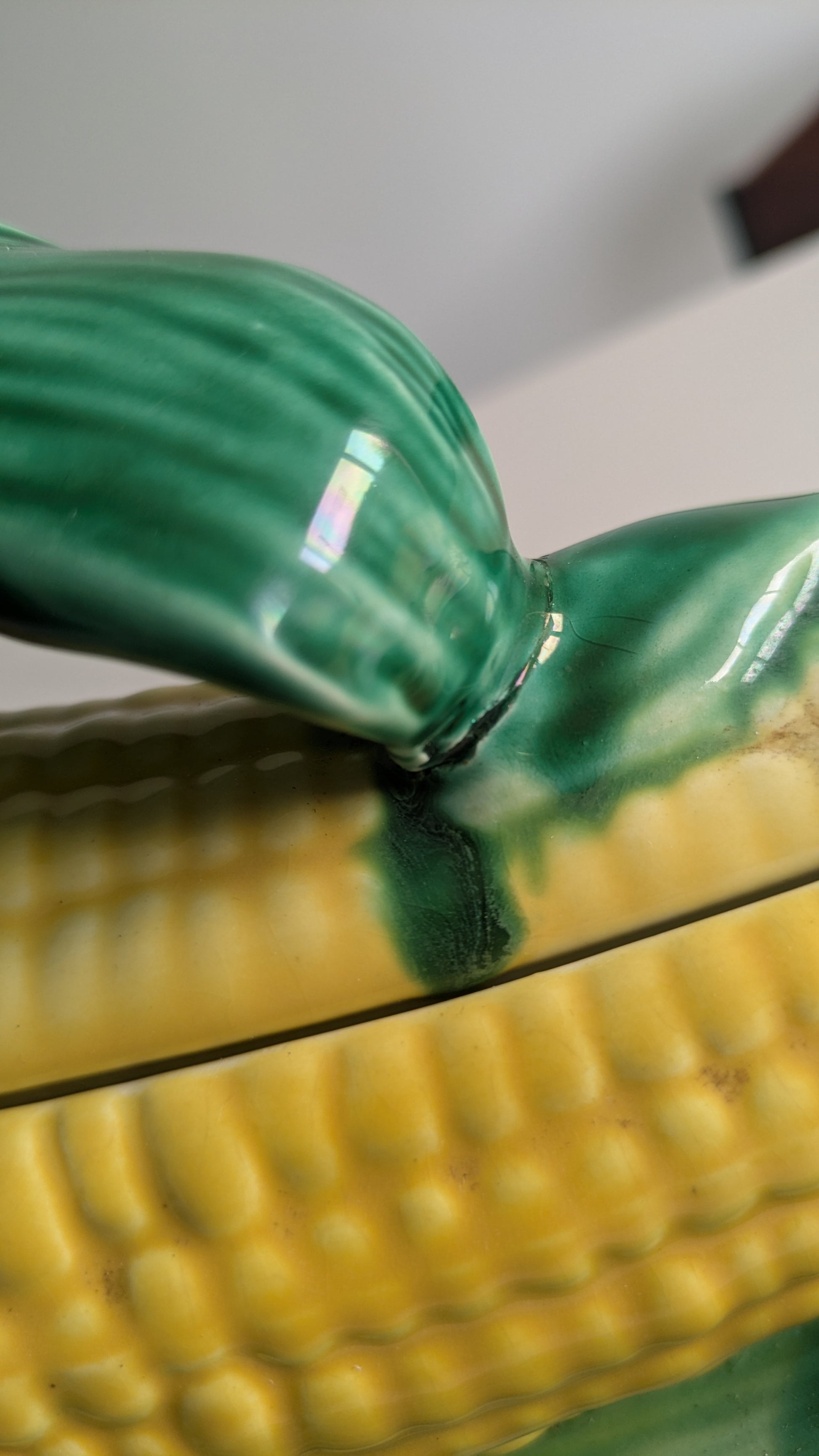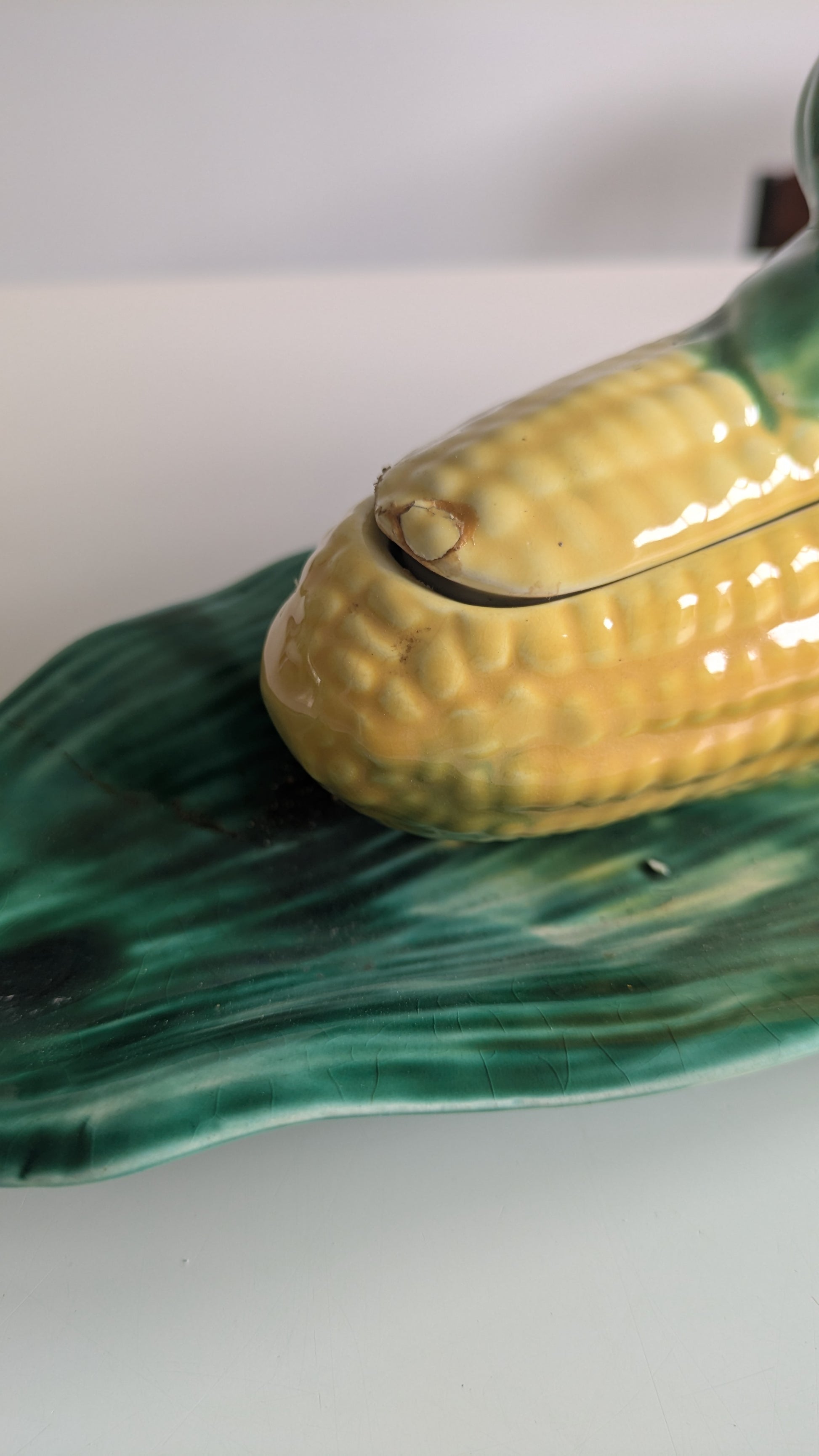 Saucière épis de maïs Sarreguemines, pièce de forme ancienne et rare . État général satisfaisant, voir photo en détail.