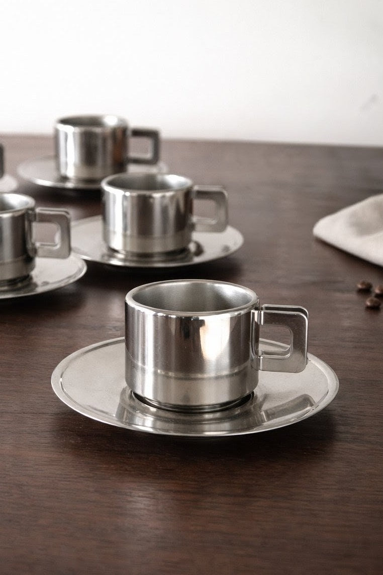 Ce set de 6 tasses à café avec soucoupes Casalinghi Italie incarne l’esthétique italienne des années modernistes : lignes pures, proportions équilibrées et acier inoxydable intégral.