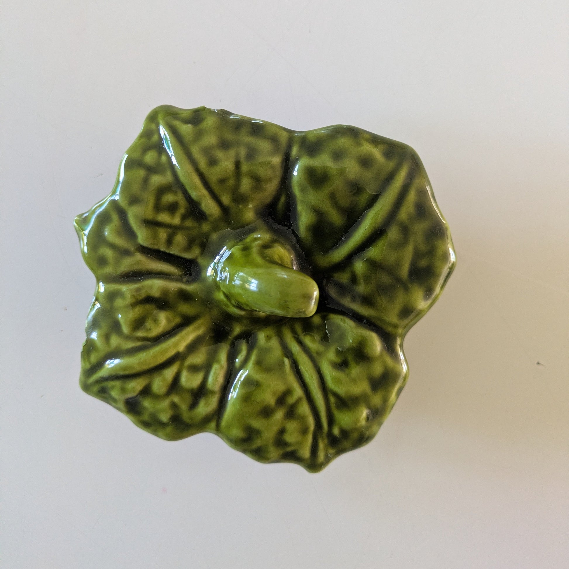 Cette petite théière se distingue par son travail de sculpture minutieux imitant la texture d'un melon. Sa teinte vert pâle nuancée et son couvercle orné d'une tige délicate en font un objet de décoration à part entière. La barbotine, célèbre pour son relief et sa brillance, donne à cette pièce un aspect authentique et chaleureux.